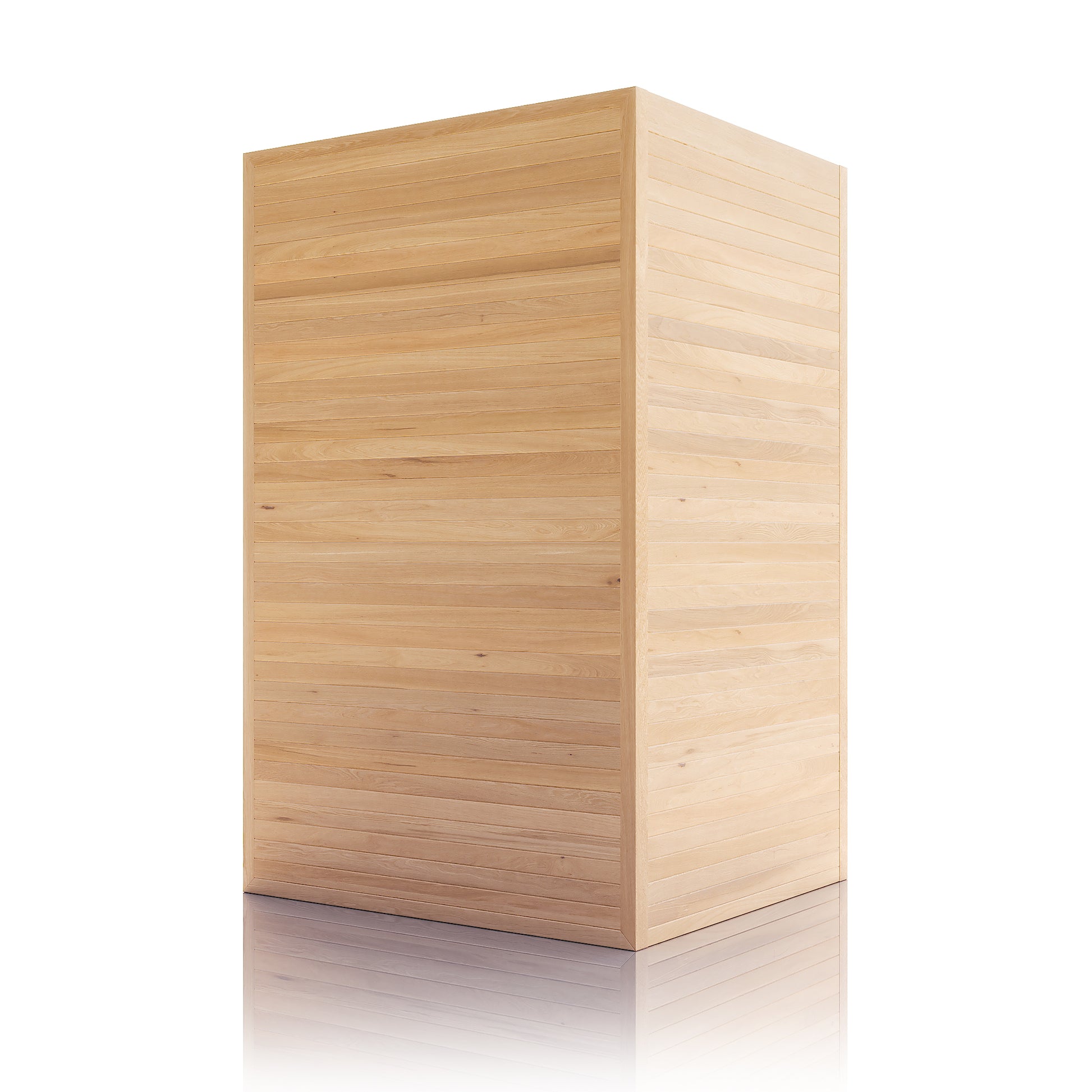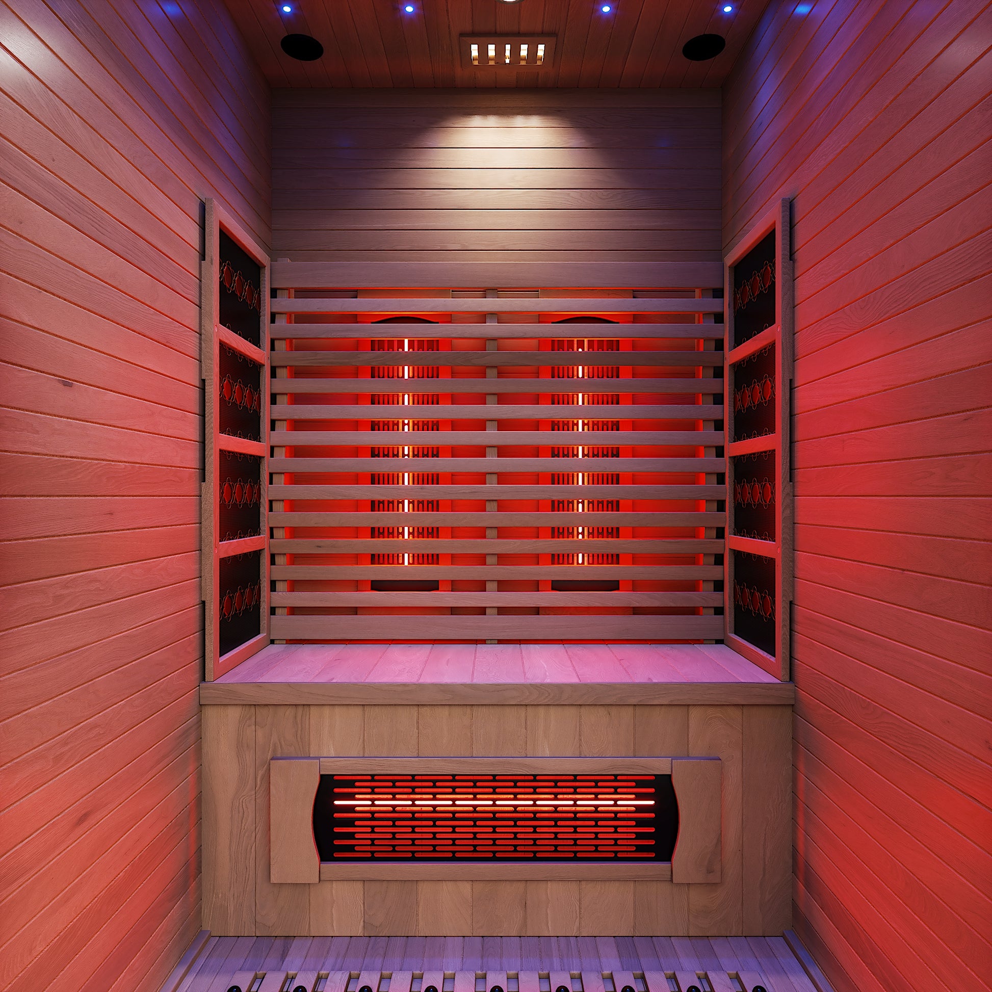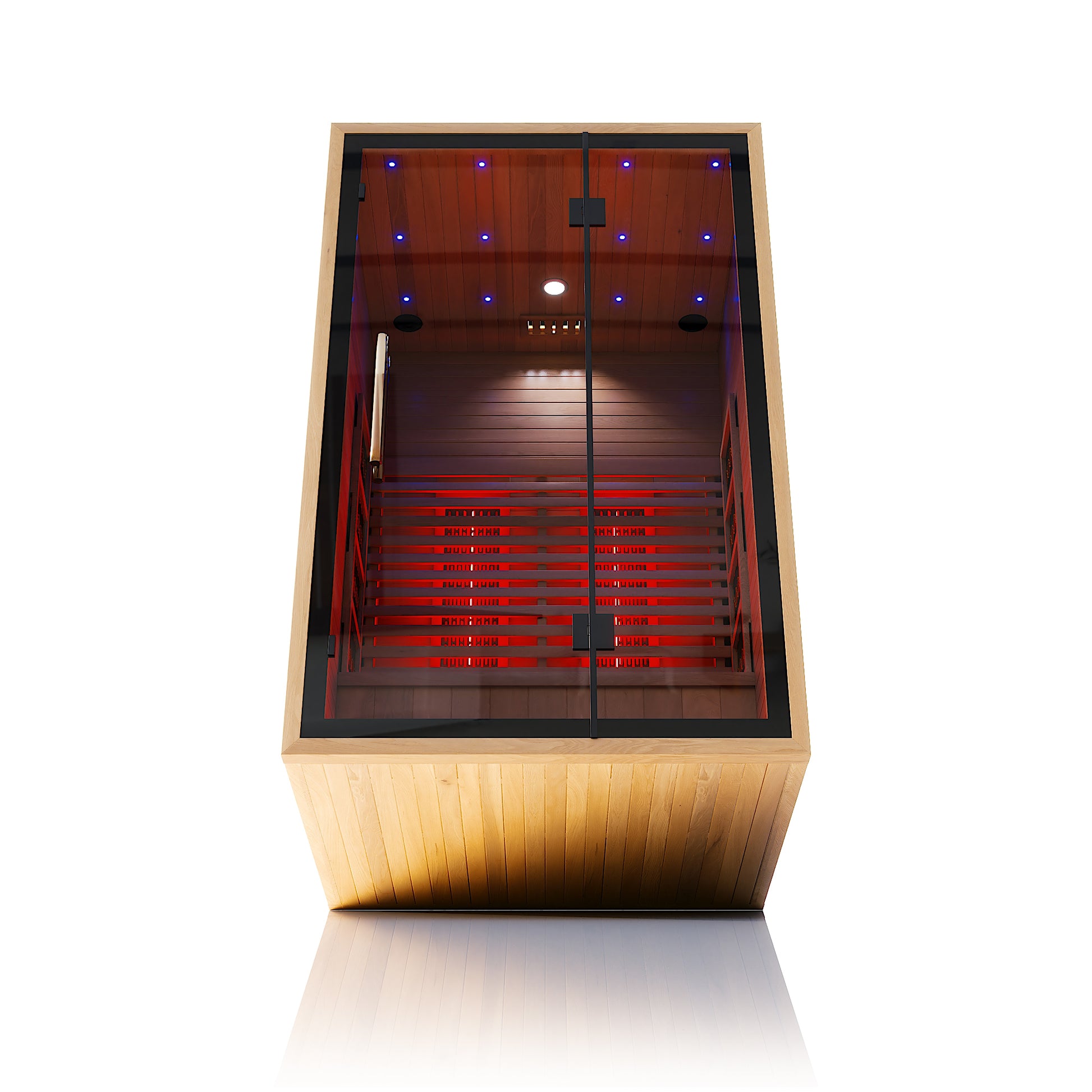 It is crafted from premium Canadian Hemlock, accommodates 1-2 person, features a 1750 W full spectrum + carbon heater (110–120 V, 15 A) with a temperature range of 0–140°F, includes a mobile app control system, remote control, 7-color light therapy lamp, breathable skylight, oxygen bar, temperature sensor, reading light, and Bluetooth speaker, and offers a removable bench and carbon crystal heating plates for efficient, evenly distributed heat, deeper detoxification, improved circulation, skin rejuvenation, and pain relief.