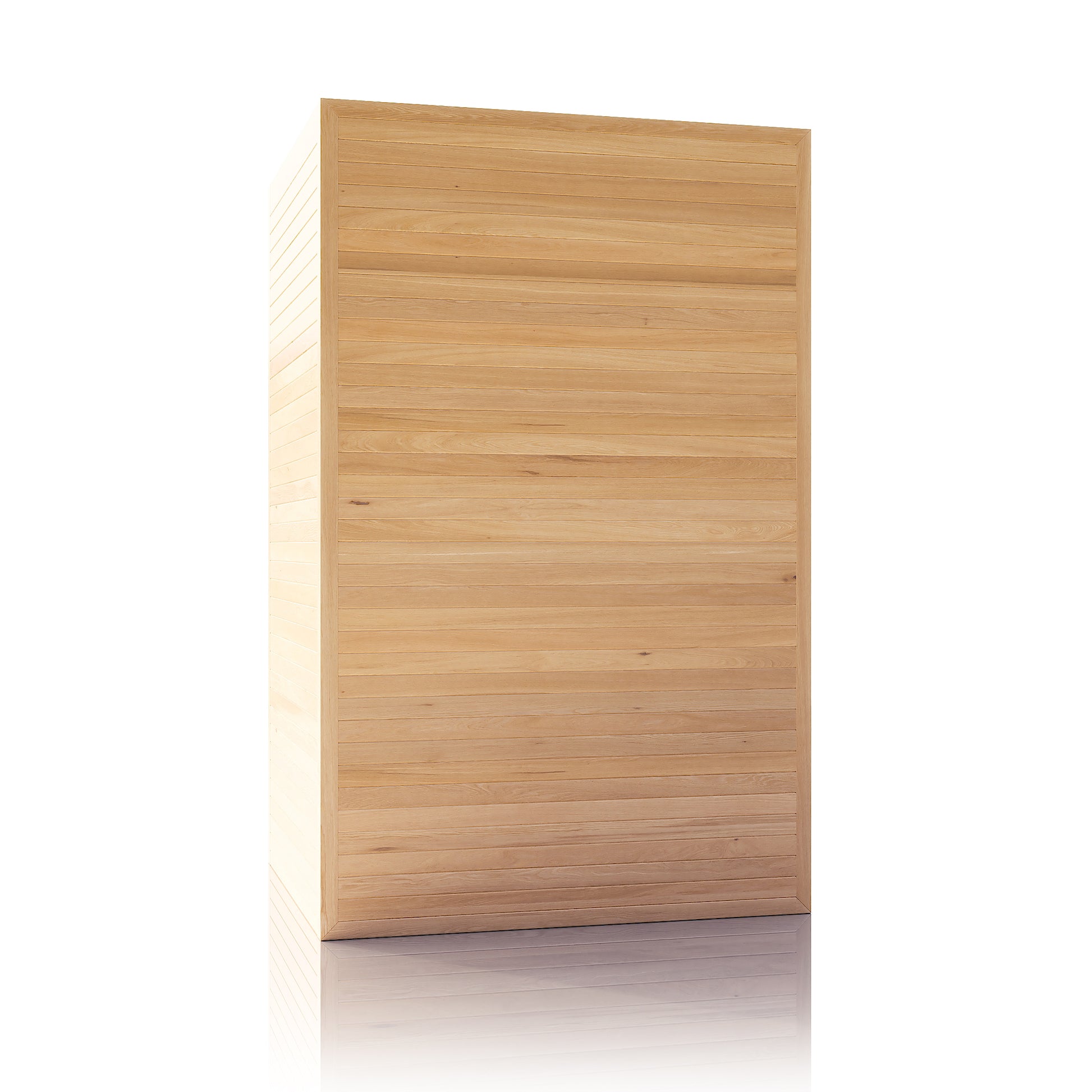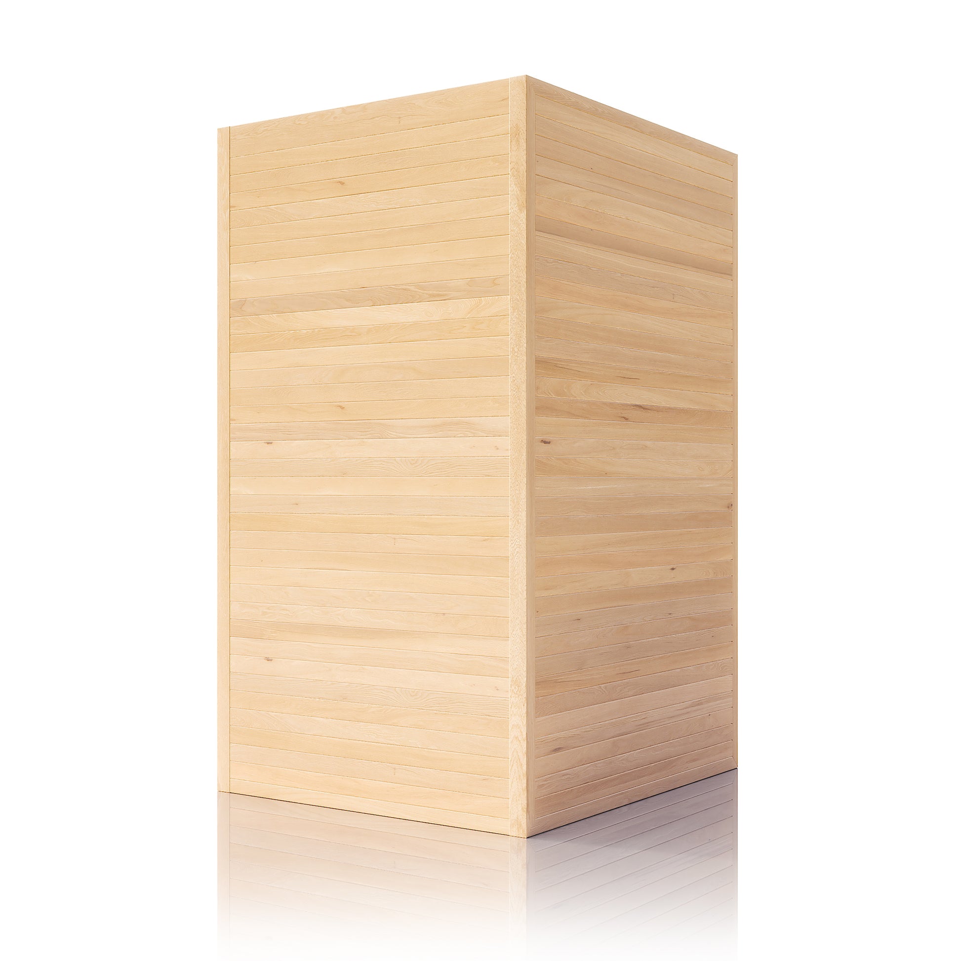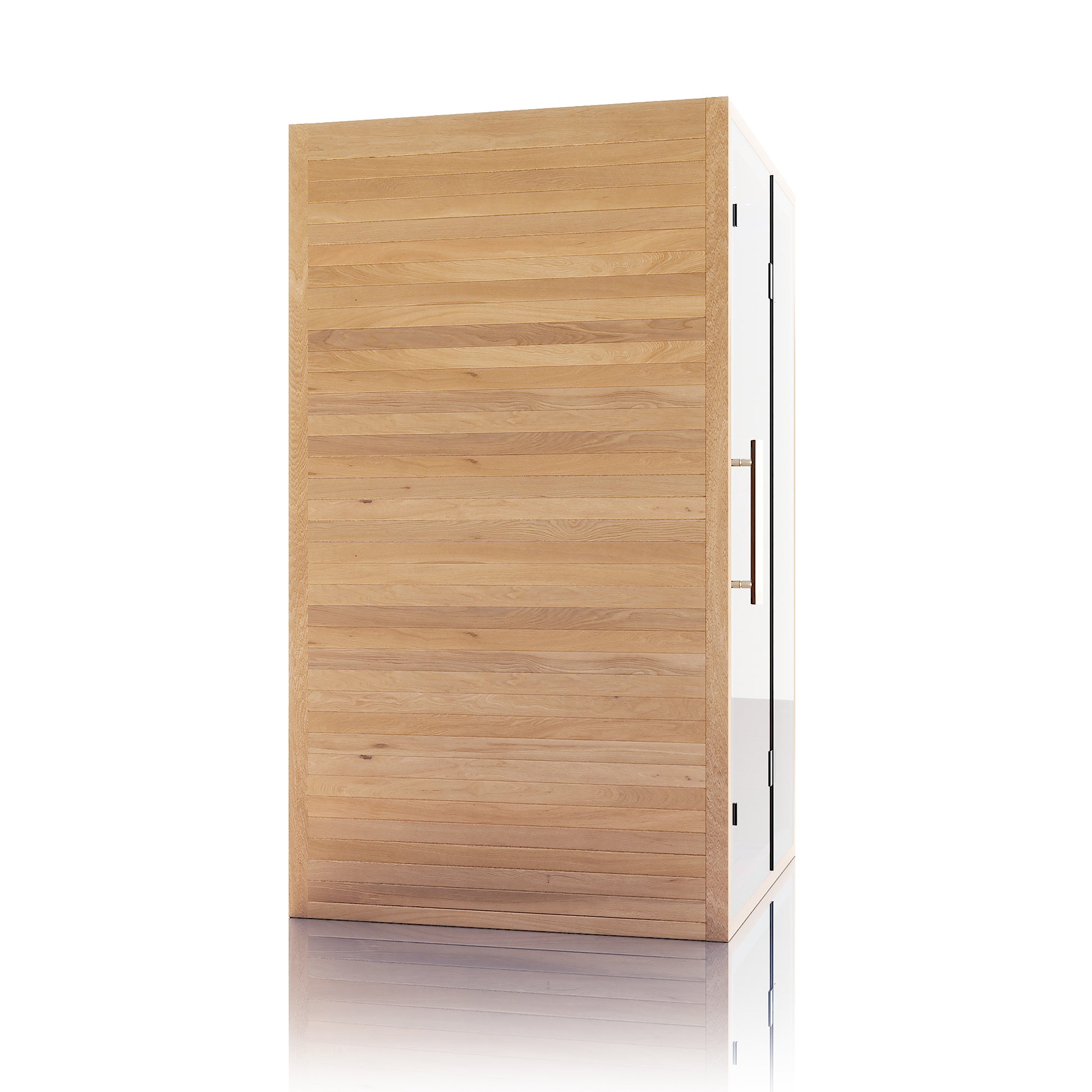 It is crafted from premium Canadian Hemlock, accommodates 1-2 person, features a 1750 W full spectrum + carbon heater (110–120 V, 15 A) with a temperature range of 0–140°F, includes a mobile app control system, remote control, 7-color light therapy lamp, breathable skylight, oxygen bar, temperature sensor, reading light, and Bluetooth speaker, and offers a removable bench and carbon crystal heating plates for efficient, evenly distributed heat, deeper detoxification, improved circulation, skin rejuvenation, and pain relief.